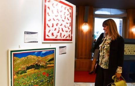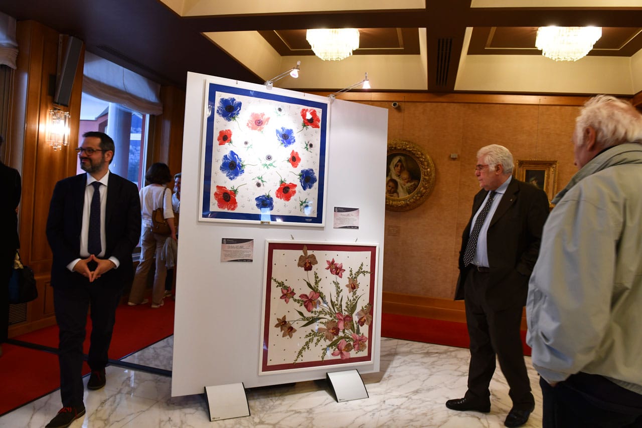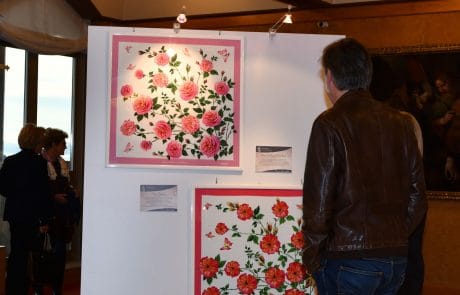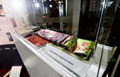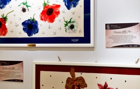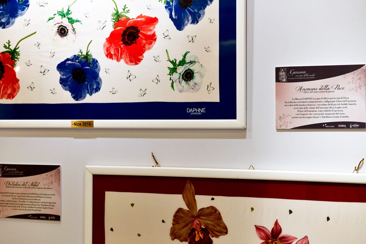 Completa l’esposizione, una sezione dedicata alle creazioni della Maison Daphn, casa di moda sanremese che ha iniziato negli anni ‘70 la sperimentazione su seta con tanto di pennelli e colore, disegnando i primi fiori della Riviera. Il caleidoscopio di foulard floreali in mostra in Banca Carige vuol essere un omaggio a cinquant’anni di creatività, nella miglior tradizione del made in Italy e della valorizzazione della bellezza del territorio ligure.