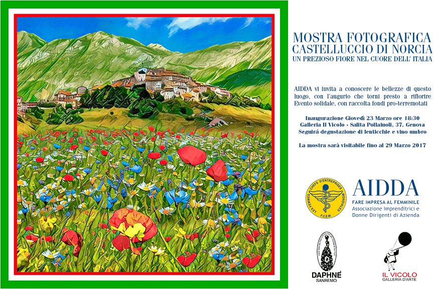 Questo è il tema centrale della mostra “Castelluccio di Norcia – Un prezioso fiore nel cuore dell’Italia”, in calendario a Genova, dal 23 al 29 marzo, e che sarà ospitata dalla Galleria Il Vicolo, in Salita Pollaiuoli, 37. L’evento, organizzato dall’associazione nazionale AIDDA, unione di imprenditrici e donne dirigenti d’azienda, in collaborazione con la Maison DAPHNÉ di Sanremo, sarà occasione di promuovere una raccolta fondi per il progetto “Castelluccio di Norcia”, che contribuirà alla rinascita di un’attività artigiana o di un’impresa femminile umbra, attraverso la rete di AIDDA.