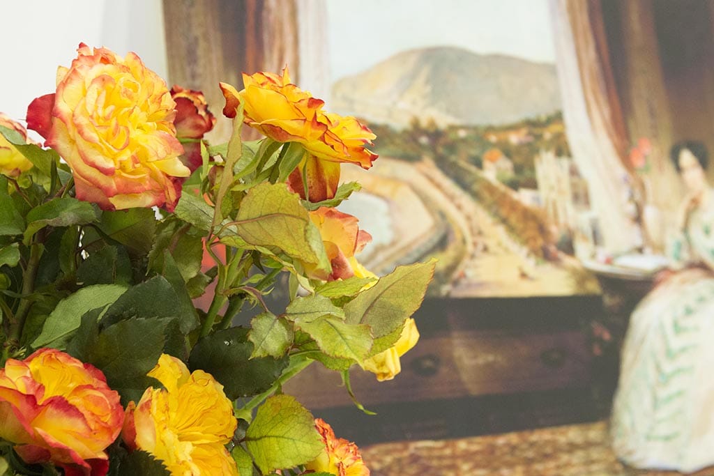 In mostra due abiti sontuosi, originali dell’epoca, appartenuti a nobildonne russe contemporanee della Zarina Marija Aleksandrovna, una serie di pannelli che raffigurano l’affresco storico di fine ‘800, oggetti rari con lo stemma della famiglia imperiale Romanov ed una particolare realizzazione stilistica contemporanea in seta della rosa Romanov dell’Atelier DAPHNÉ, un omaggio della storica casa di moda sanremese a questa illustre ospite di Sanremo.