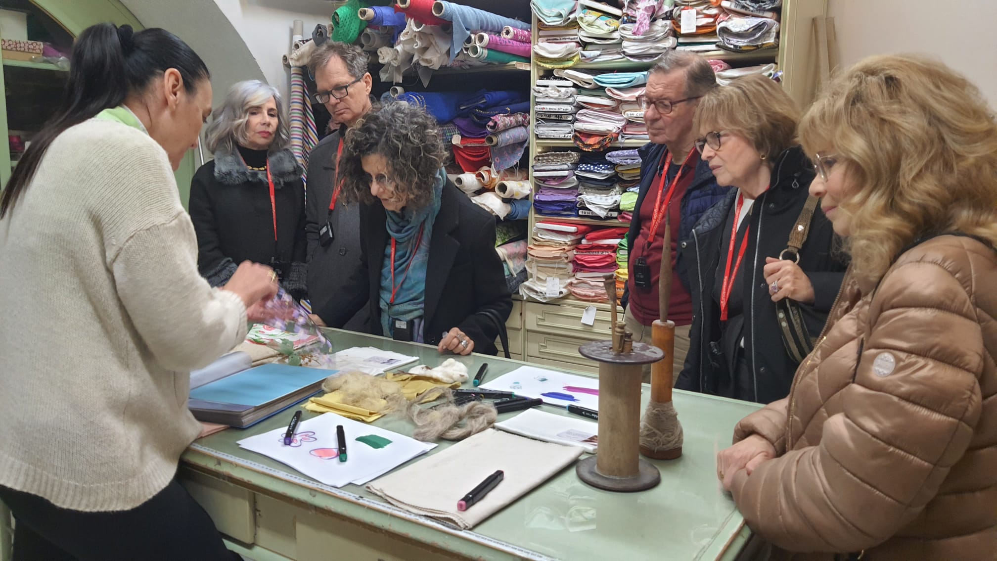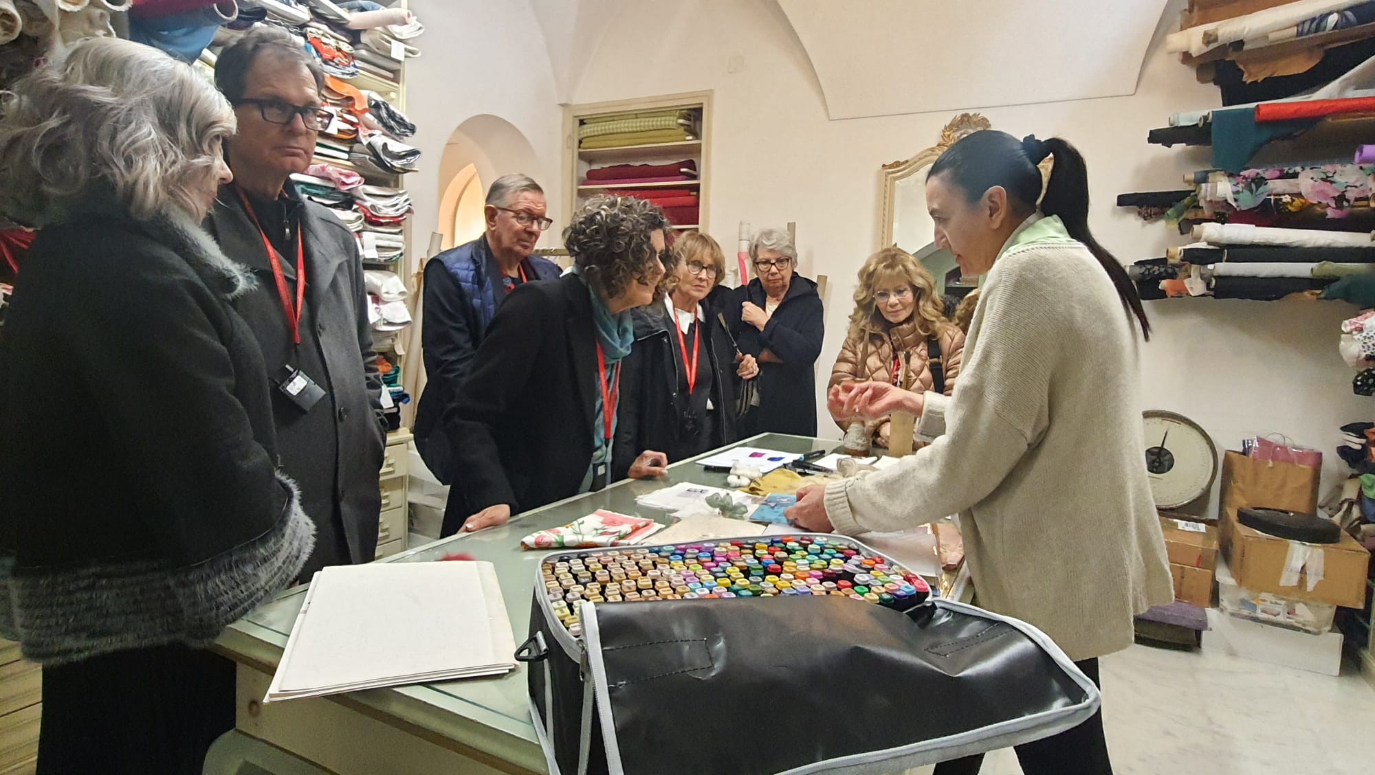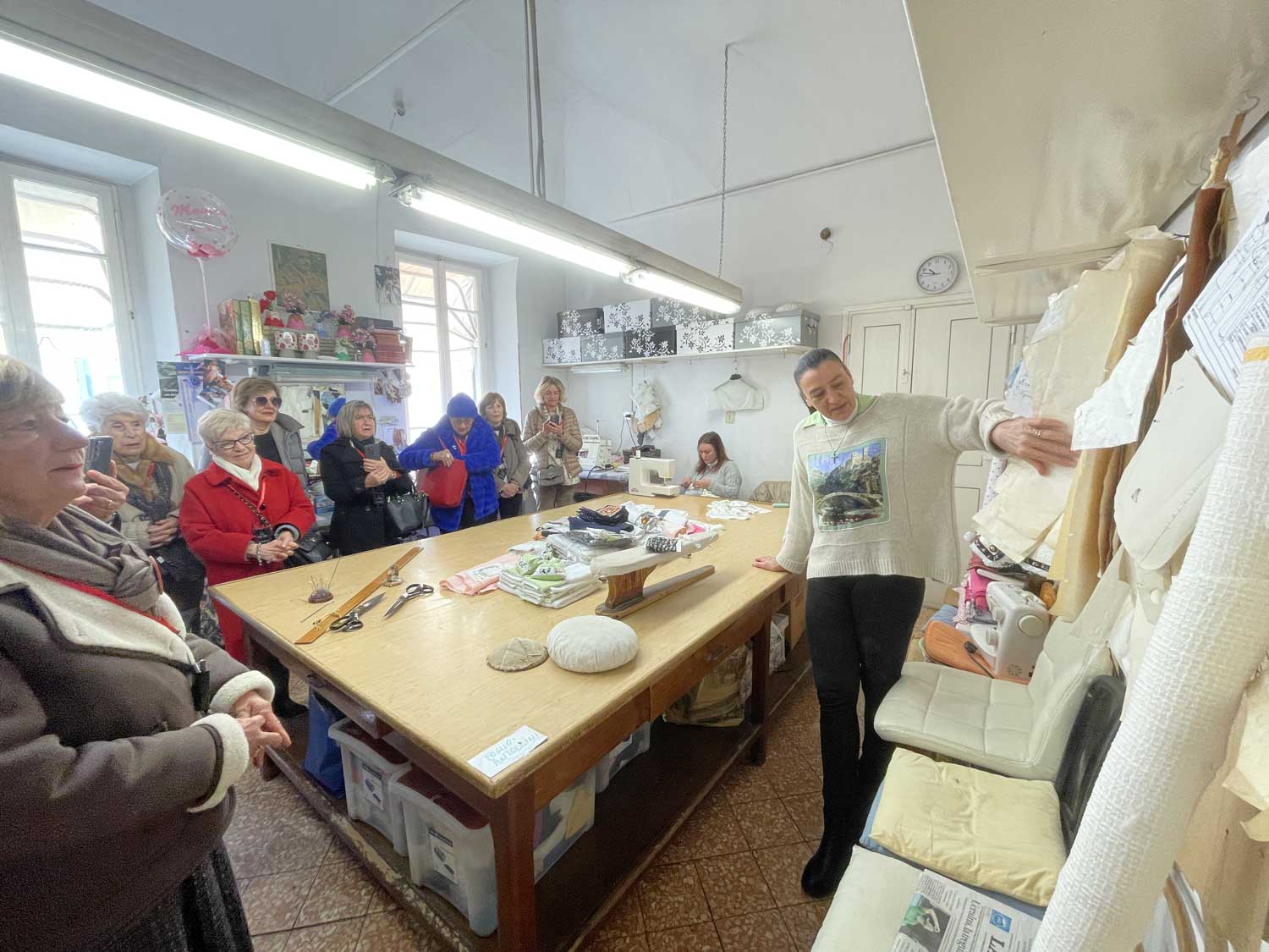 Durante la visita, gli iscritti FAI hanno attraversato le sale del Museo, custode di abiti antichi e memorie della Sanremo d’un tempo, per poi immergersi nel cuore operativo della Maison, l’Atelier. È qui che la tradizione della bottega storica si è manifestata in tutta la sua attualità: un luogo dove il “saper fare” tramandato dalle generazioni continua a generare bellezza.