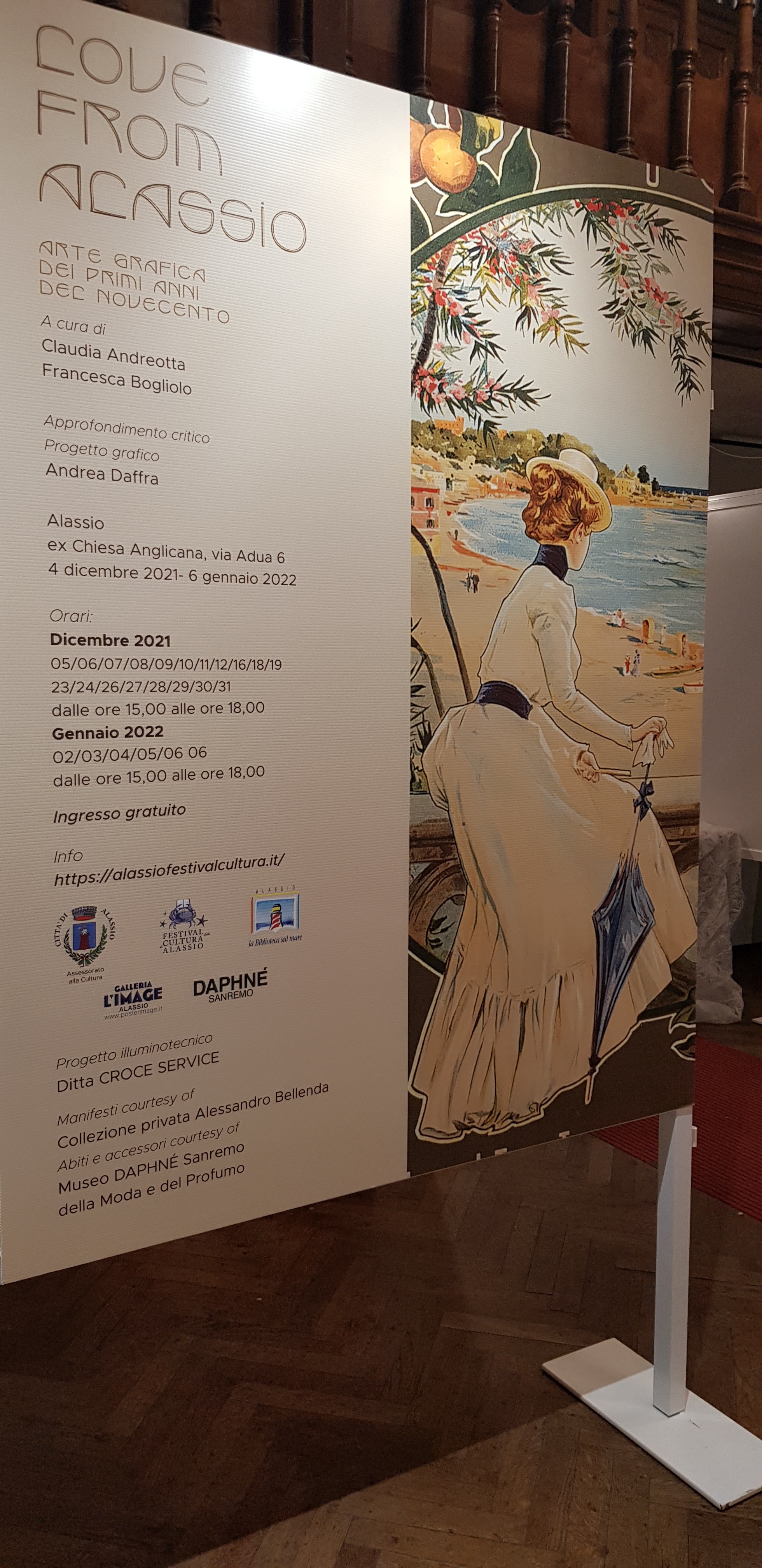Nell’ambito delle iniziative del Festival della Cultura, in questi giorni è possibile visitare nella Ex Chiesa Anglicana la mostra “Love from Alassio” arte grafica dei primi anni del Novecento: una selezione di manifesti pubblicitari, nati dalle collaborazioni tra le agenzie pubblicitarie e artisti di assoluto rilievo come Craffonara, Codognato e il savonese Romoli, tra i maggiori cartellonisti del Novecento. Esposti anche raffinati abiti d’epoca e arredi in grado di condurre il visitatore in un vero e proprio viaggio nel tempo. L’esposizione è stata realizzata grazie alle preziose collaborazioni della Galleria l’Image nella persona del titolare e appassionato collezionista Alessandro Bellenda e del Museo Daphnè della Moda e del Profumo di Sanremo.