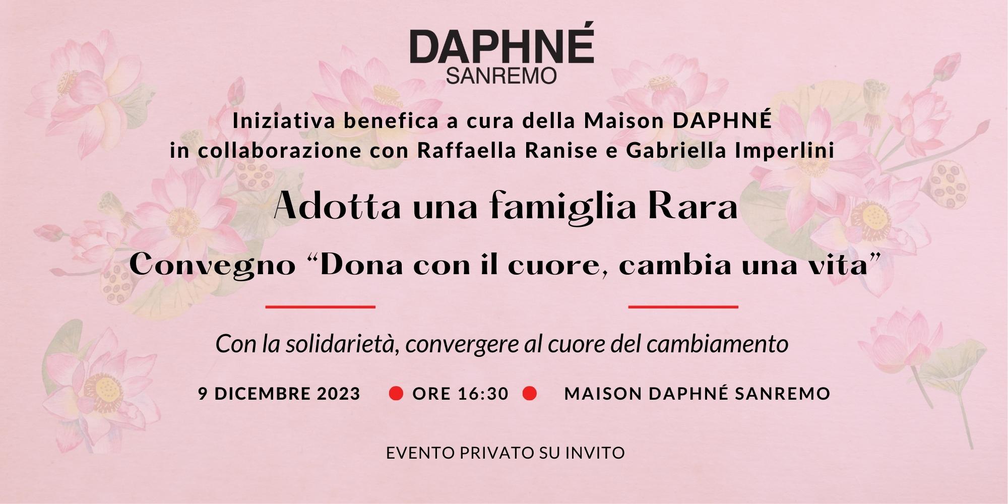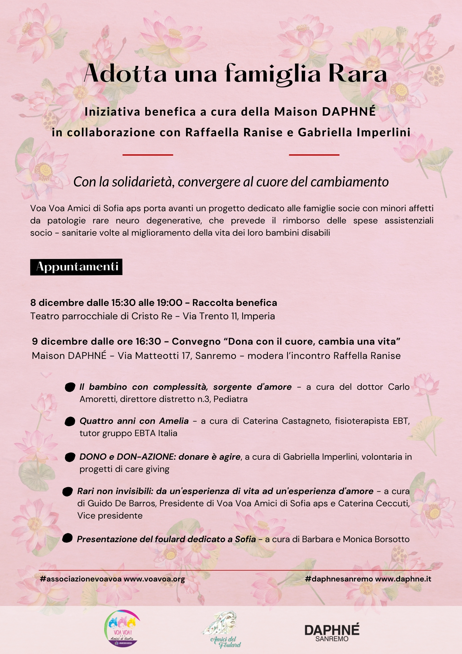 DAPHNÉ Saremo ha concluso il ciclo di incontri di “Sinergie al Femminile” 2023 organizzati grazie alla collaborazione di Raffaella Ranise, con la solidarietà del dono dedicando il quinto incontro ad un convegno a favore VOA VOA Amici di Sofia APS Associazione che porta avanti un progetto dedicato alle famiglie socie con minori affetti da patologie rare neuro-degenerative.
